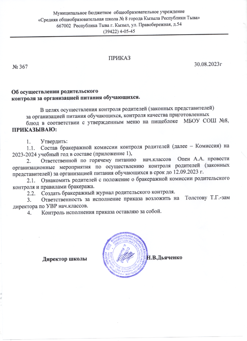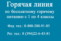 Ответственным лицом за организацию и качество горячего питания обучающихся является школа. Родители (законные представители)  могут также принимать участие в контроле за организацией питания. Порядок проведения мероприятий по родительскому контролю за организацией питания обучающихся, в том числе регламентирующего порядок доступа законных представителей обучающихся в помещения для приема пищи, регламентируется локальным нормативным актом школы. С указанным документом можно ознакомиться на сайте школы. По всем возникшим вопросам вы можете обратиться к директору школы или по телефону горячей линии по школе 8394-22-4-01-78