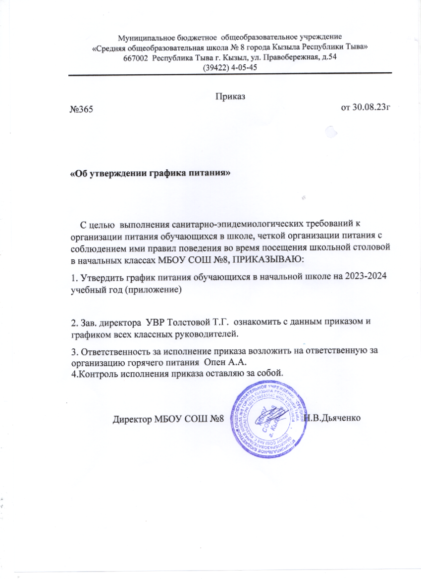 В целях реализации Послания Президента Российской Федерации Федеральному Собранию от 15.01.2020 в части организации бесплатного горячего питания для обучающихся начальных классов, в соответствии с Федеральным Законом 01.03.2020 гола № 47-ФЗ «О внесении изменений в Федеральный Закон «О качестве и безопасности пищевых продуктов» и ст. 37 ФЗ «Об образовании в Российской Федерации», Порядком обеспечения бесплатного горячего питания обучающихся начального общего образования в муниципальных общеобразовательных организациях города Кызыла (утвержден Постановлением Мэрии города Кызыла № 664 от 27.11.2020г.), Приказом Департамента по образованию Мэрии города Кызыла от 14.09.2020 года № 272 в МБОУ СОШ №8 г. Кызыла РТ проведен комплекс мероприятий по организации горячего питания учащихся начальной школы.