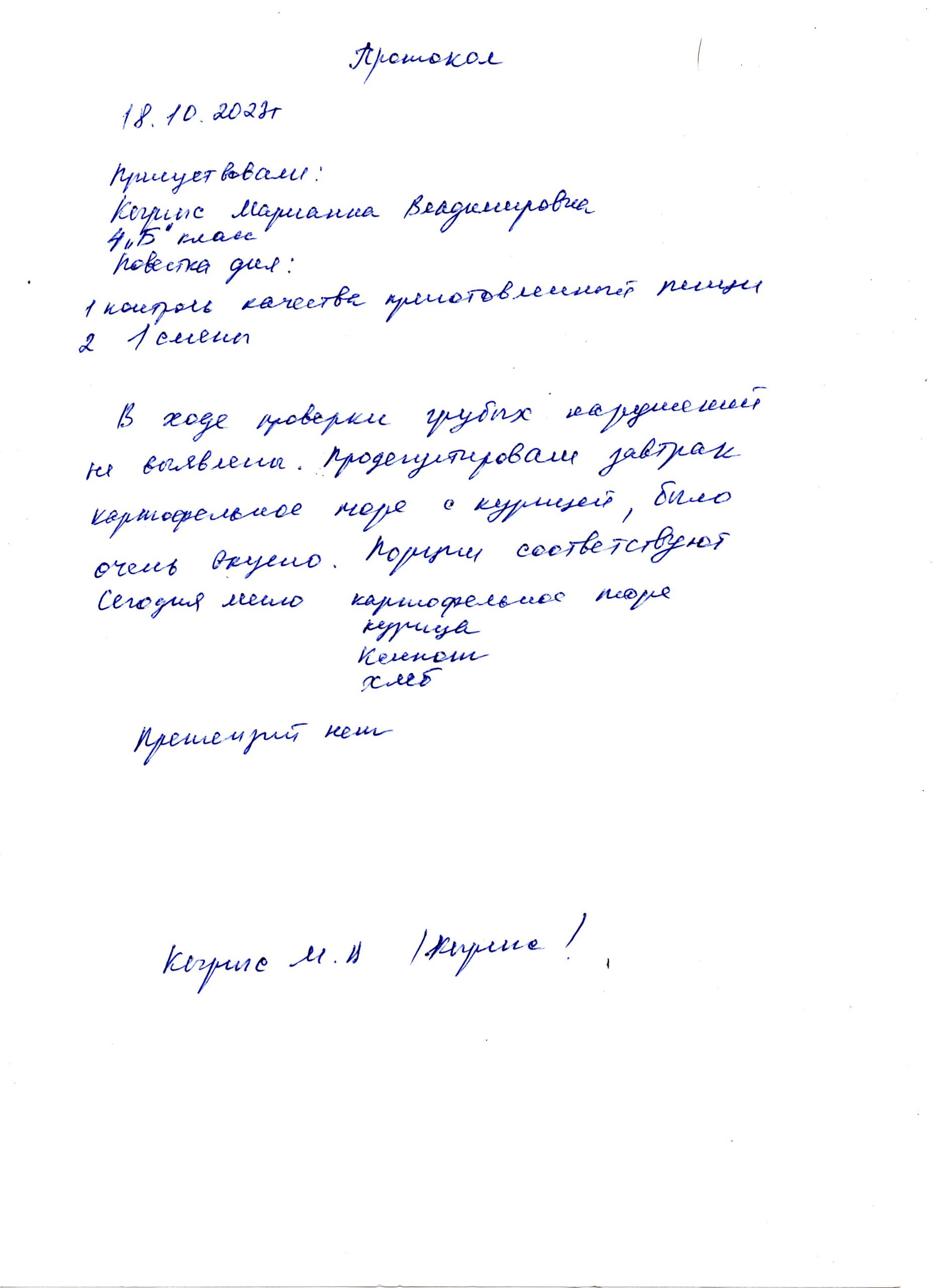 - 18.10.2023 г Родительский контроль. Цель: контроль качества приготовленной пищи.