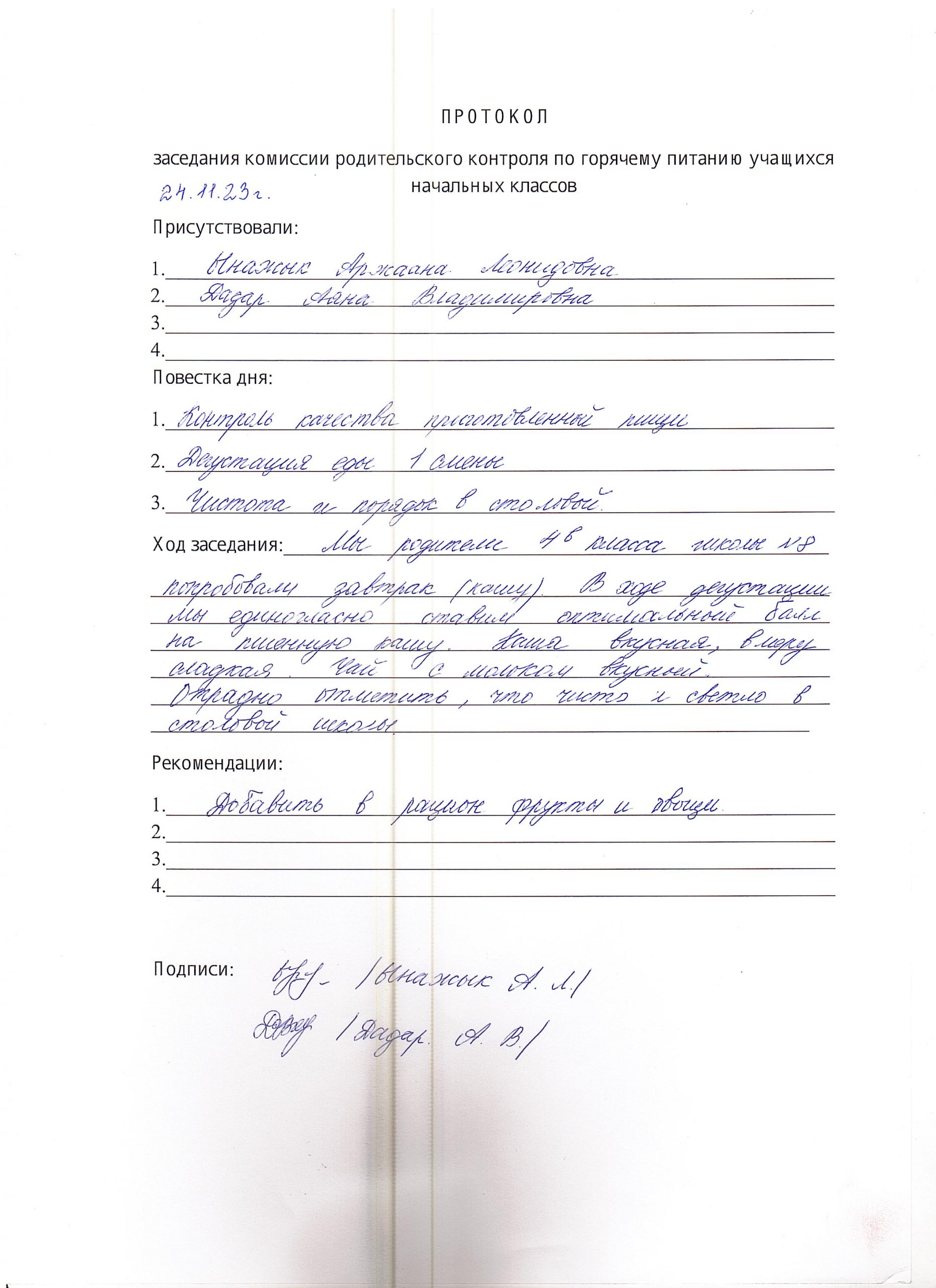 24 ноября в нашей школе состоялся очередной плановый контроль школьного питания представителями родительской общественности.