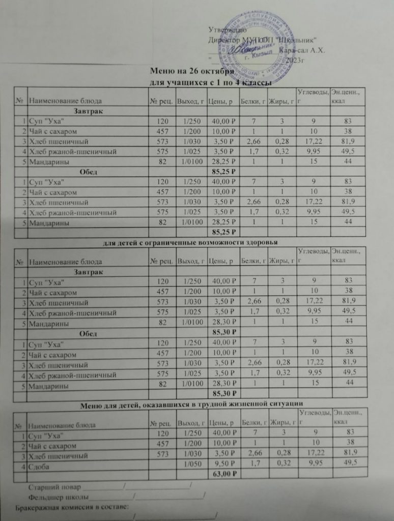 9.10.2023 г. Родительский контроль горячего питания в столовой МБОУ СОШ # 8 г. Кызыла