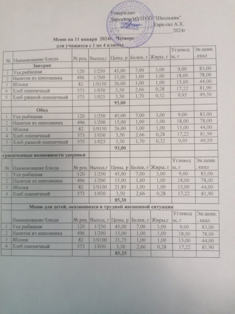 Родительский контроль обеспечения горячего питания в школе 11 января 2024 года.